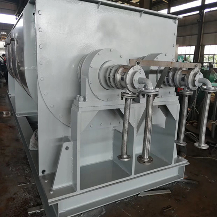 槳葉式干燥機是一種以傳導為主的臥式攪拌型干燥機。主體結構為帶有夾套的W型殼體內(nèi)裝有成對的空心低速回轉中空軸,軸上焊有若干攪拌葉片,夾套和空心攪拌葉片,其內(nèi)均通以熱載體,兩種加熱面同時對物料加熱。熱載體通常從干燥機中部送入,通過呈攪拌狀態(tài)的物料層表面,從另一側排出。